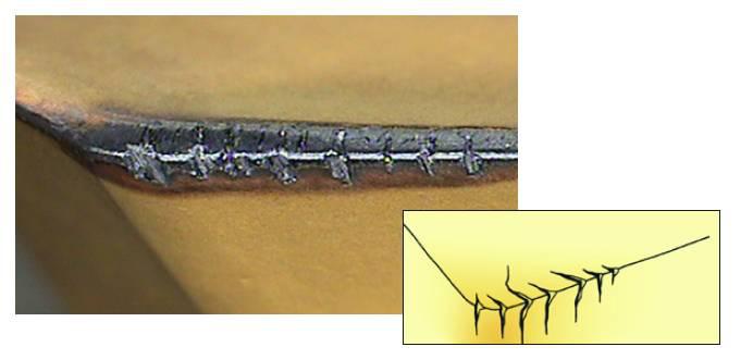 Wear Reasons:It will easily appear multiple cracks that Perpendicular to the cutting edges when the cutting temperature from hot to cold. Hot cracking is associated with interrupt turning,which often occur in the milling process, and improper use of coolant can aggravate this situation.